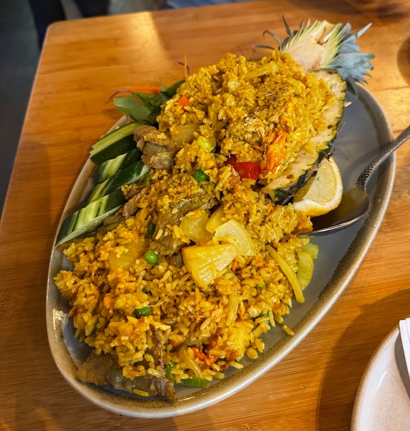 We arrived a bit after 5pm and the place was already full—lots of takeaway orders too. It was an especially sunny day ☀️ and many Western customers were enjoying their food outside while soaking up the sun. Considering the strong UV, we decided to sit indoors. The restaurant has more than just indoor seating—there’s also a backyard area, which adds to its charm. As a corner eatery, it has a distinct character and cozy neighborhood feel. They have a separate brunch menu with plenty of options, but since we came around dinner time, we ordered from the main menu. 🔥 Fire Coconut – Signature Dish 🔥 This flaming seafood coconut pot was super fun and unique. It’s a fusion of Thai creamy curry sweetness with a hint of tom yum sour and spicy flavor. Sounds like a strange mix, but it actually worked really well! The “fire” is mostly for show—doesn’t affect the taste—but definitely adds to the experience. The coconut meat inside the pot was delicious too. Would recommend trying it! 🍍 Pineapple Fried Rice If you want it served inside a whole pineapple, there’s an extra $8 charge. We opted for the regular plating since we didn’t think it was necessary. The fried rice looked fairly standard but came in a generous portion. It tasted fresh and wasn’t greasy—well-balanced in flavor. We chose the beef version, and the beef pieces were surprisingly large and tender. Tasty overall! 🦆 Duck with Plum Sauce We saw this one highly recommended, but we were too full—definitely saving it for next time! 💰 A pleasant surprise at checkout They offer a cash discount, and the owner kindly rounded down the total. It felt really genuine and generous—small things like this make a difference. Overall, this place left a great impression. Would love to come back and explore more of the menu!